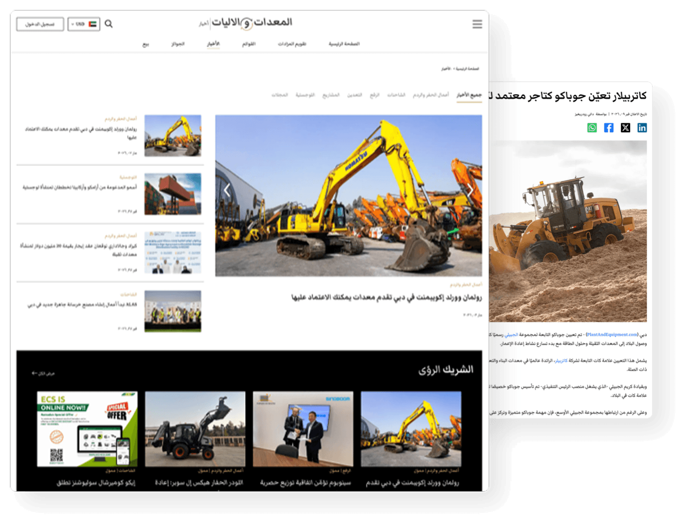 احصل على ظهور ضمن منصة الأخبار الرقمية الخاصة بالمعدات الآلية والتي يقرأها محترفو الصناعة عبر الشرق الأوسط وأفريقيا. تضع ميزات الأخبار علامتك التجارية كلاعب نشط وموثوق في السوق. هذا يبني المصداقية مع تعزيز الظهور طويل الأمد للعلامة التجارية.